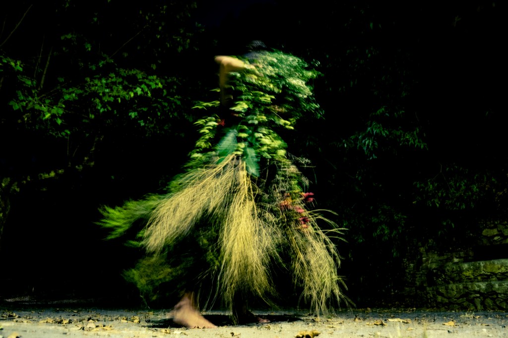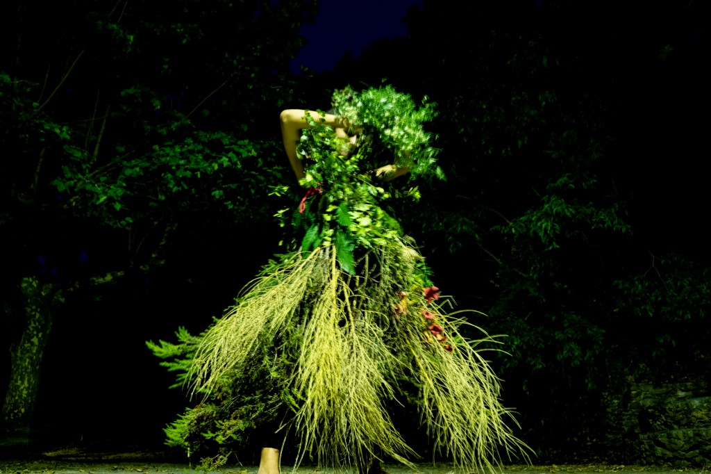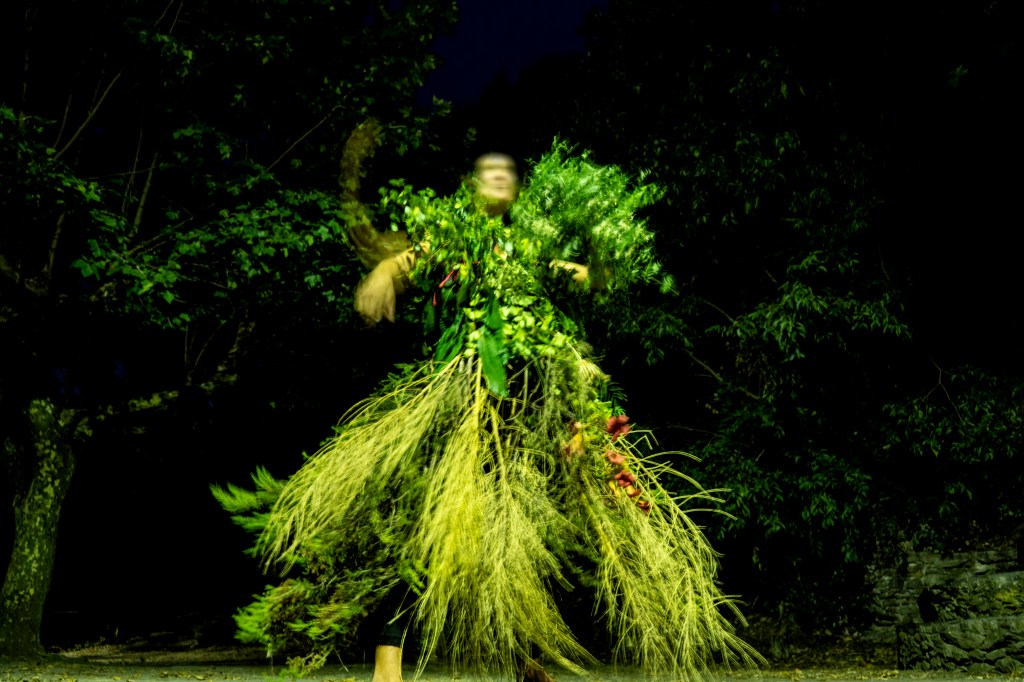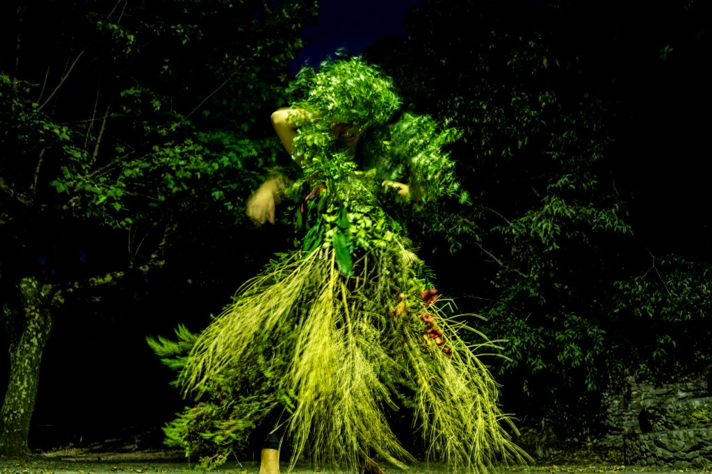 Núria Iglesias (Piròmana d’Argos) amb l’acció Glòbul Acròstic entén el concepte de tragèdia com la unió entre l’afirmació terrenal de la vida vinculada a les divinitats de la rauxa (Pan, Dionís, Cibele) i la seva capacitat oracular absorbida pel déu Apol·lo a través de les píties o sibil·les. Aquesta dualitat l’ha representat a través d’un vestit confeccionat amb material natural existent a la vinya i format per dues peces. La part superior és un escut fet de fulla de parra silvestre –vinculada a la força masculina del déu Pan i a la branca familiar paterna lligada als boscos de Susqueda– i que funciona com a protector, mentre que la part inferior és una faldilla amb forma de cúpula o corol·la feta de branques de bruc i flors–que fa referència a la deessa Venus i/o a la Verge del Carme per parlar de la tradició marinera de la mare –. Per tant, aquest vestit de dues parts simbolitza la unió del pare i de la mare, el masculí i femení, la terra i l’aigua.