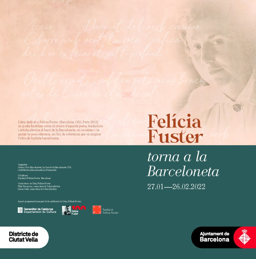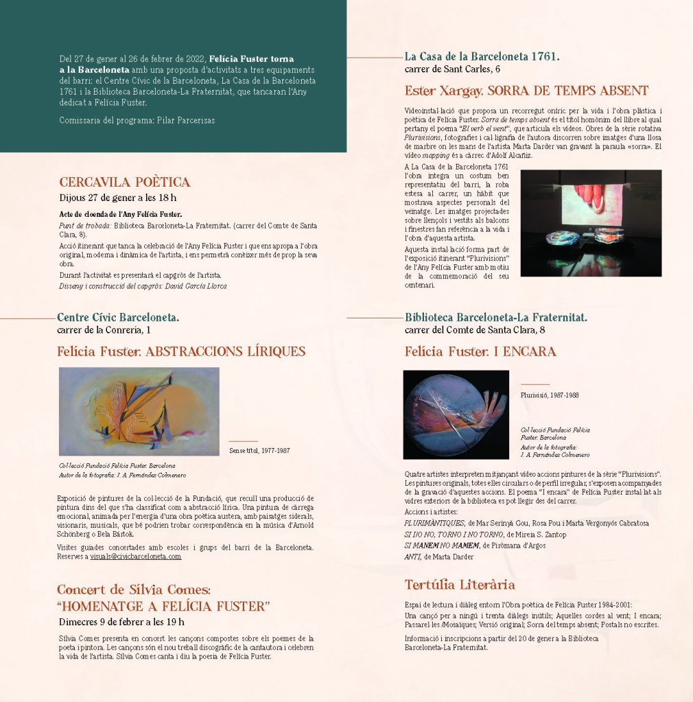 FELÍCIA FUSTER, TORNA A LA BARCELONETA és un cicle d’esdeveniments commemoratius i divulgatius al barri on va nèixer l’artista. Hi participo amb la videoacció SI MANEM NO MAMEM (2021) en l’exposció col·lectiva FELÍCIA FUSTER. I ENCARA. Serà a la biblioteca del barri. S’inaugura el 25/01/2022 i es podrà veure fins el 26/02/2022.