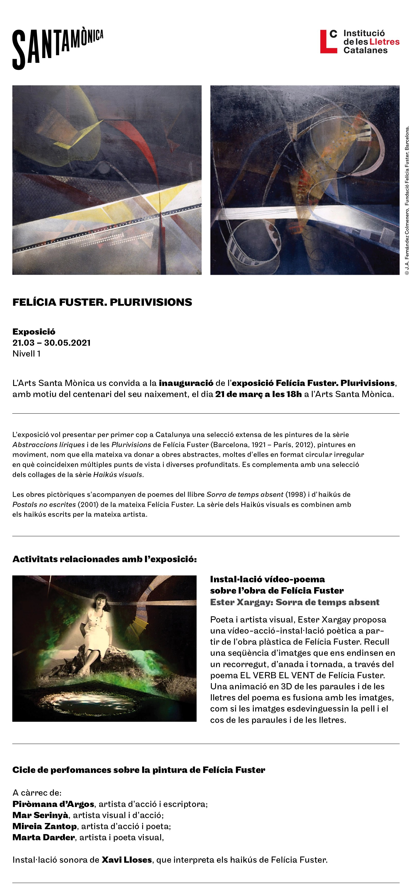La videoperformance SI MANEM NO MAMEM (2021) serà mostrada a l’Arts Santa Mònica (BCN) en motiu de l’exposició de pintures i poemes de FELÍCIA FUSTER -any en què es commemora el centenari de l’artista-. A cura de Pilar Parcerisas, l’acció s’emmarca en el treball d’interpretació contemporània de la seva sèrie de pintures PLURIVISIONS – en el meu cas la peça Nº42-. S’inaugura el 21/03/2021, dia internacional de la poesia i hi romandrà fins el 30/05/2021.