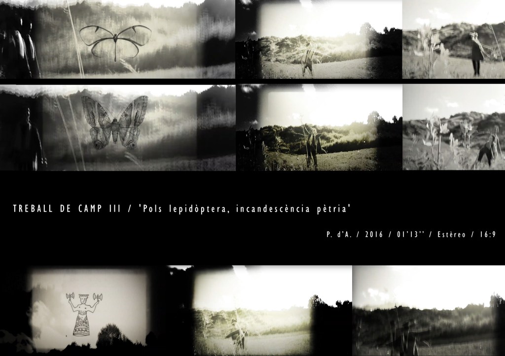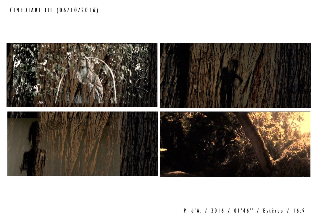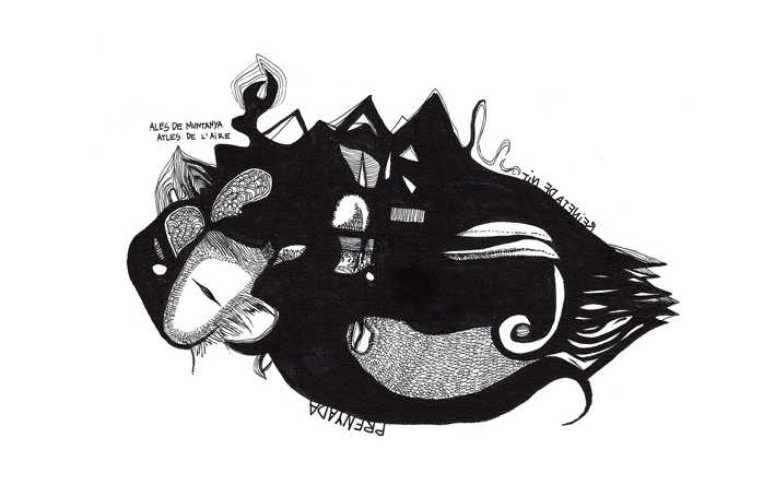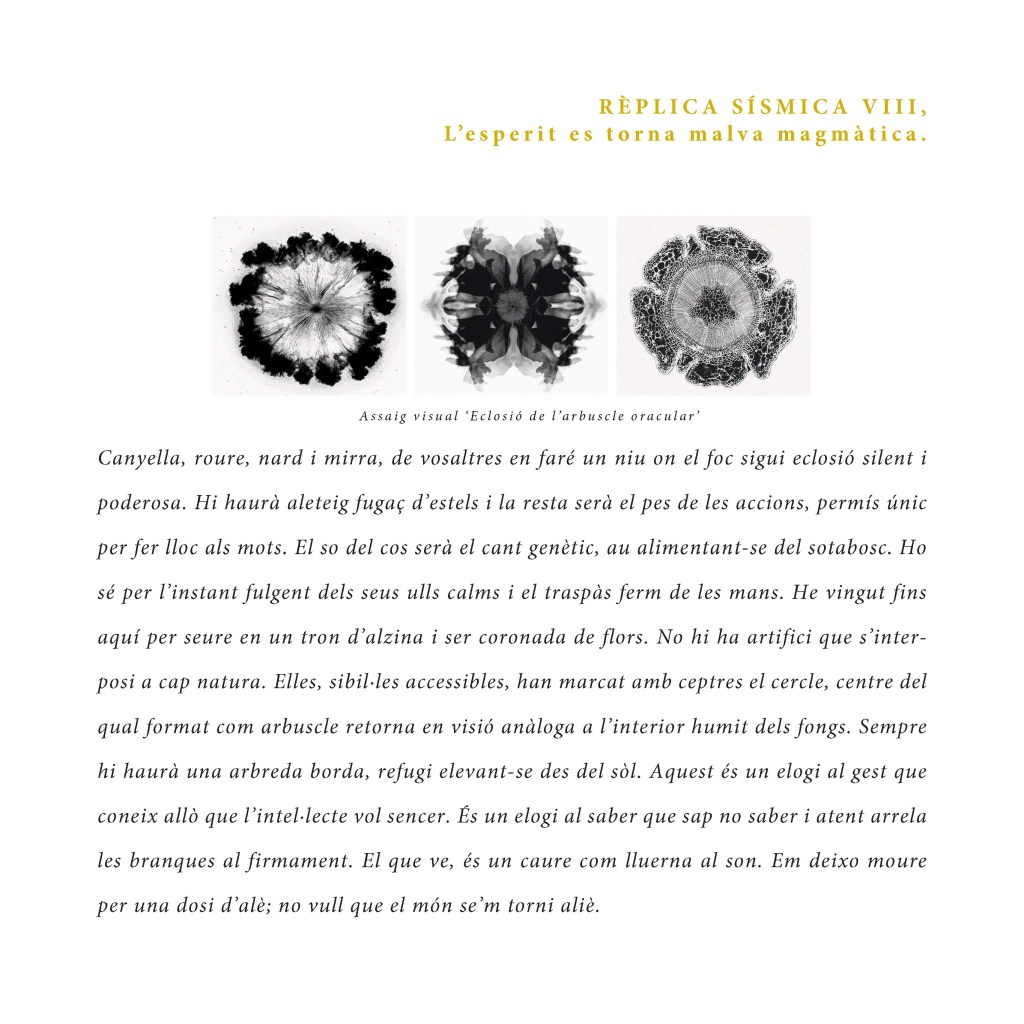 M’aixeco i em sobrevé: ‘És el moment del foc, la llavor, l’arbre i la paraula’. Reprenc la pràctica d’ahir. L’amorfisme es dilueix i apareixen paisatges, monstres, persones que queden cobertes per gruixos de terra líquida. Fa una estona he vist el que hi ha darrere la fosca, ara, coberta per les gotes d’una explosió alentida de traç i tinta, traspassa la vida subterrània en aparences efímeres. Sostrats de memòria viva donen lloc a senyals pareidòliques verticals, per ser empassades, de nou, a la riquesa geogràfica d’un paper.