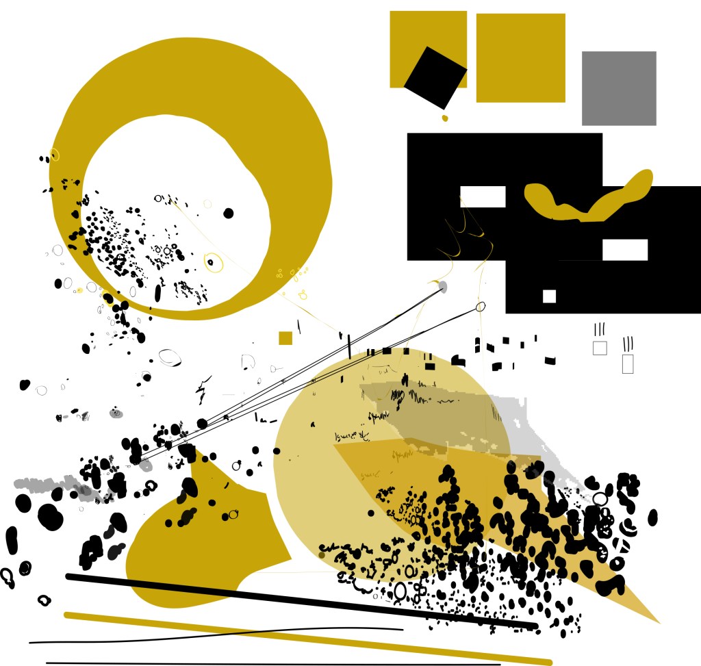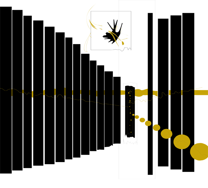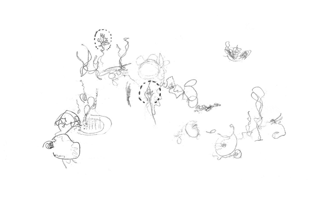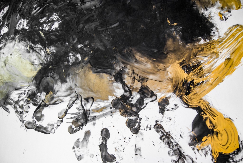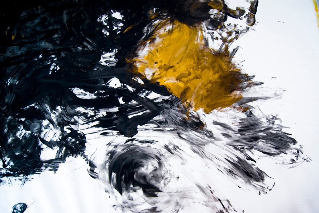 M’aixeco i em sobrevé: ‘És el moment del foc, la llavor, l’arbre i la paraula’. Reprenc la pràctica d’ahir. L’amorfisme es dilueix i apareixen paisatges, monstres, persones que queden cobertes per gruixos de terra líquida. Fa una estona he vist el que hi ha darrere la fosca, ara, coberta per les gotes d’una explosió alentida de traç i tinta, traspassa la vida subterrània en aparences efímeres. Sostrats de memòria viva donen lloc a senyals pareidòliques verticals, per ser empassades, de nou, a la riquesa geogràfica d’un paper.