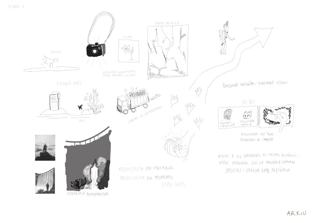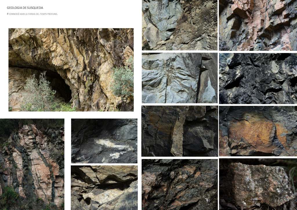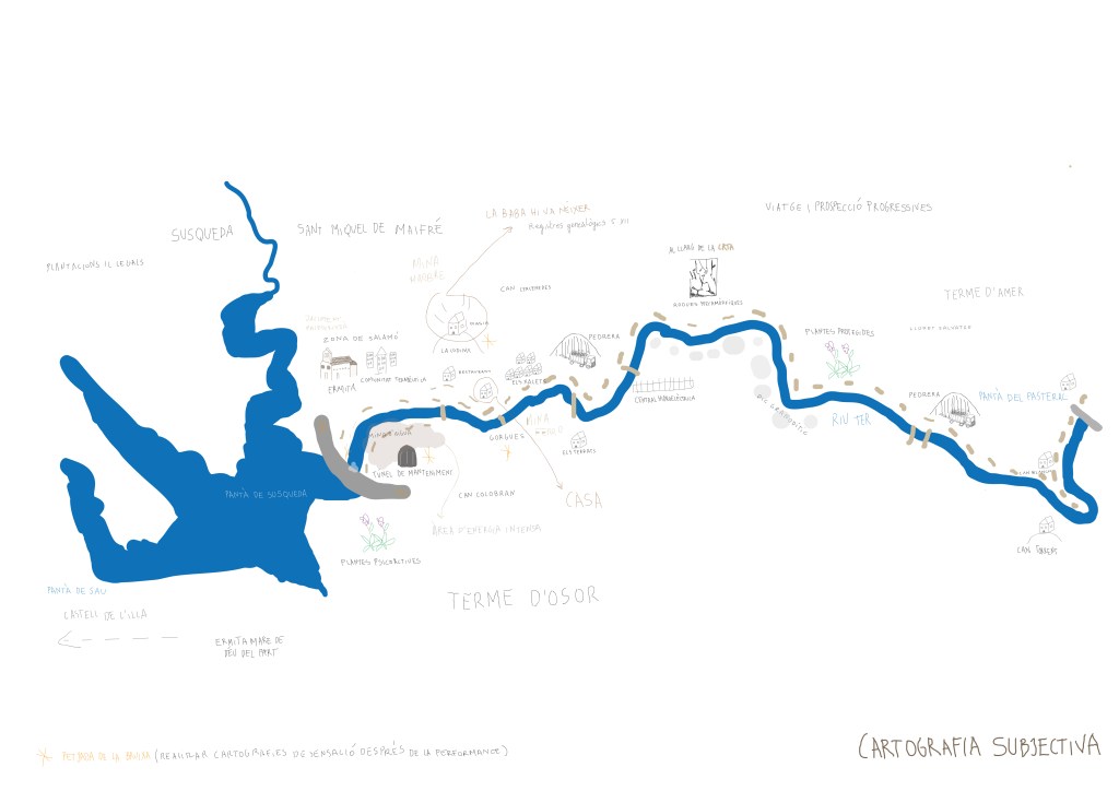 Les formes, sons i símbols, recerca, acció i experimentació fetes in situ es reflecteixen i teixeixen per mitjà d’un relat geològic. Aquest, es mobilitza gràcies al vaivé de la memòria -allò que re-cor-do, el que se’m queda de Susqueda. Exploro les dimensions de qui soc; on l’Altre és reflex que interpel·la, proposa, acompanya i m’hi vinculo. És un viatge metamòrfic on el llenguatge fort i feréstec de la tendresa s’escolta mitjançant el temps corporal, fenomenològic i biològic de ser en acció.