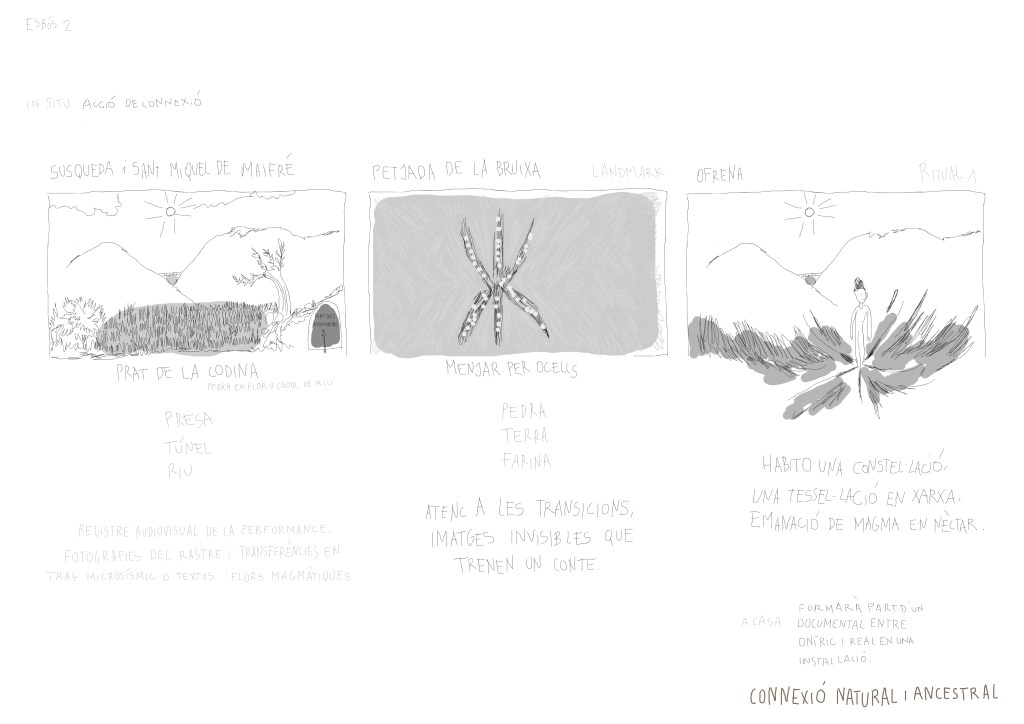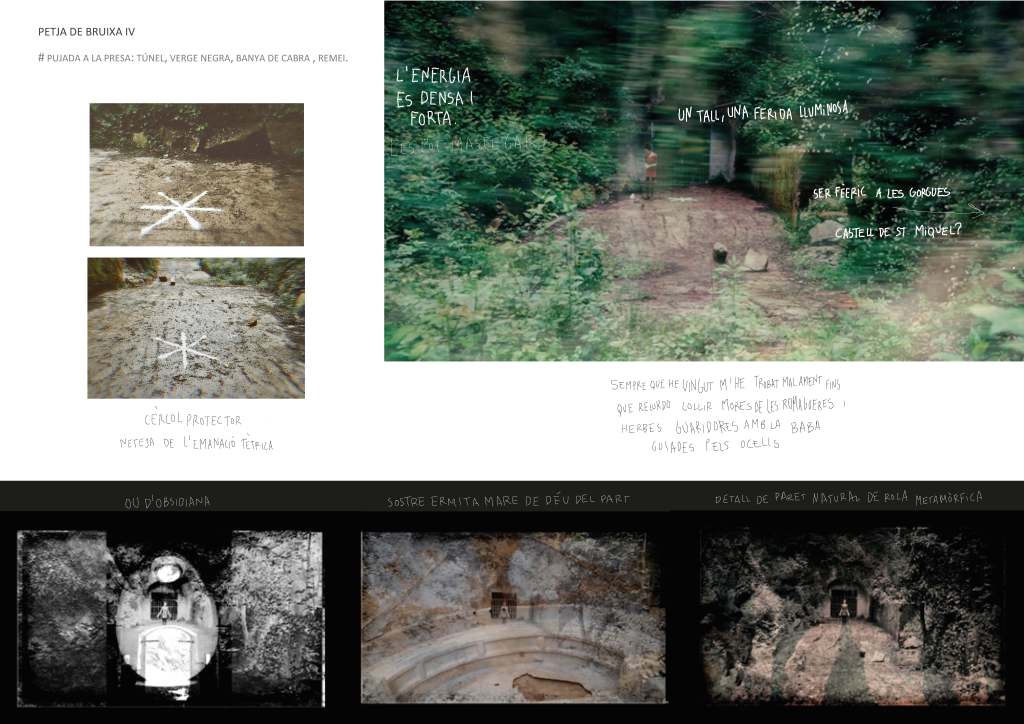 La primera forma de ritual és una pràctica vernacla anomenada Petja de Bruixa, landmark amb què s’atén la relació entre cultura i natura en diferents punts del terme d’Osor. La incursió física i performativa a l’entorn i el context abasta la carretera privada i de servei del Pantà de Susqueda des del Pasteral fins a l’Ermita de Sant Miquel de Maifré, al costat del recurs terapèutic Font Picant. Cada landmark es reconstrueix desplegant-se al costat del curs del riu Ter com a ressonància de memòria rizomàtica. La segona forma de ritual és l’acte litúrigic cristià de l’Ofrena de la comunitat del poble de Susqueda desaparegut com emplaçament geogràfic.