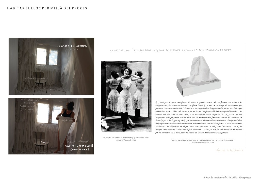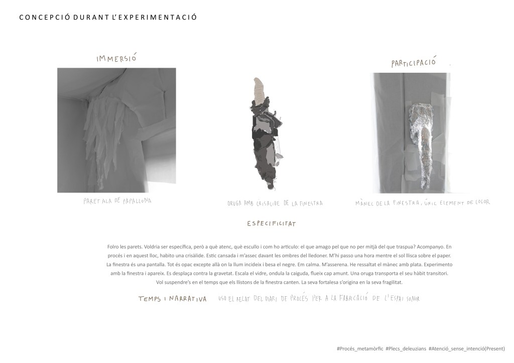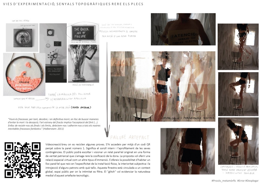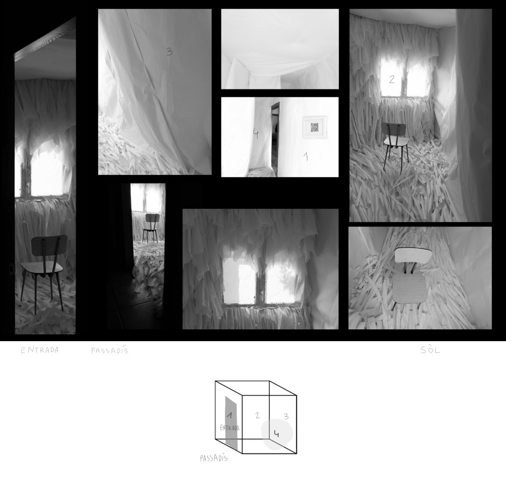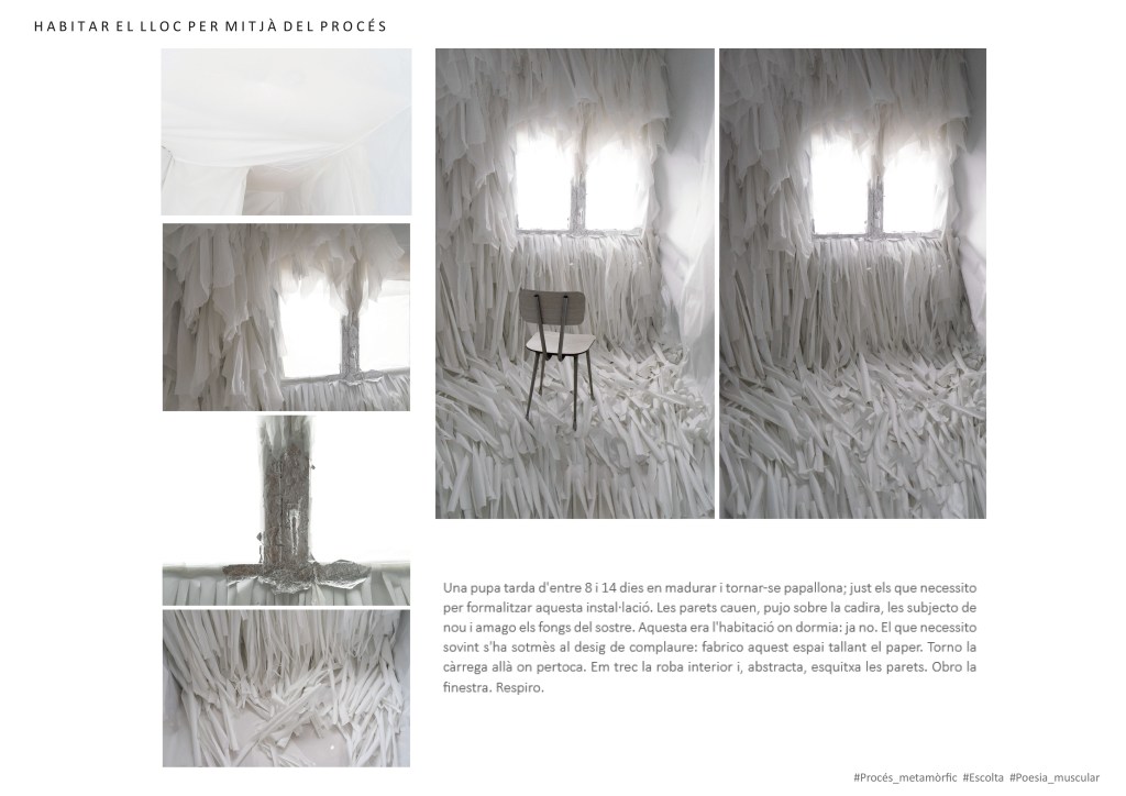 Instal·lació fabricada amb actitud fenomenològica en l’antic dormitori d’una casa. El seu ús canvia fruit de les contingències en l’espai arquitectònic original. L’aparició de fongs al sostre el torna un lloc perjudicial pel descans i és per mitjà de la instal·lació i el seu caràcter immersiu que aquests s’oculten per desplegar-se en altres esdeveniments. L’afecte que desperten una eruga transformant-se en crisàlide mentre ondula sobre el vidre de la finestra i contra la gravetat o l’ombra d’un lledoner a través de la finestra proveeix al treball d’un segon plec de contingències. Per mitjà d’una veu humana que s’hibrida amb aquestes, es narra el trànsit entre una identitat assignada i una subjectivitat sensible. D’aquesta dissolució entre el natural i el cultural, es desplega un altre plec de contingències; així és des del joc, la paròdia i la noció de fracàs i per mitjà del vídeo Failure Artifact. Entre el que hauria de ser i el que és; de la lluita esgotadora entre la perfecció de l’ideal cultural i la imperfecció que emana dels afectes, de la seva riquesa o diversitat, sorgeixen reflexions sobre com ens vinculem amb l’Altre. La imperfecció remet a la impredictibilitat de la seva resposta, als plecs d’ombra del paper en blanc, a la seva sensibilitat material que, amb relació a l’espai sonor registrat, demana escolta i cura quan, en contacte amb els peus, cruix i, mentre ens hi submergim, podria dir: Ara soc un refugi i també la desconstrucció d’una cotilla, patró de complaença que deixo anar i transformo.